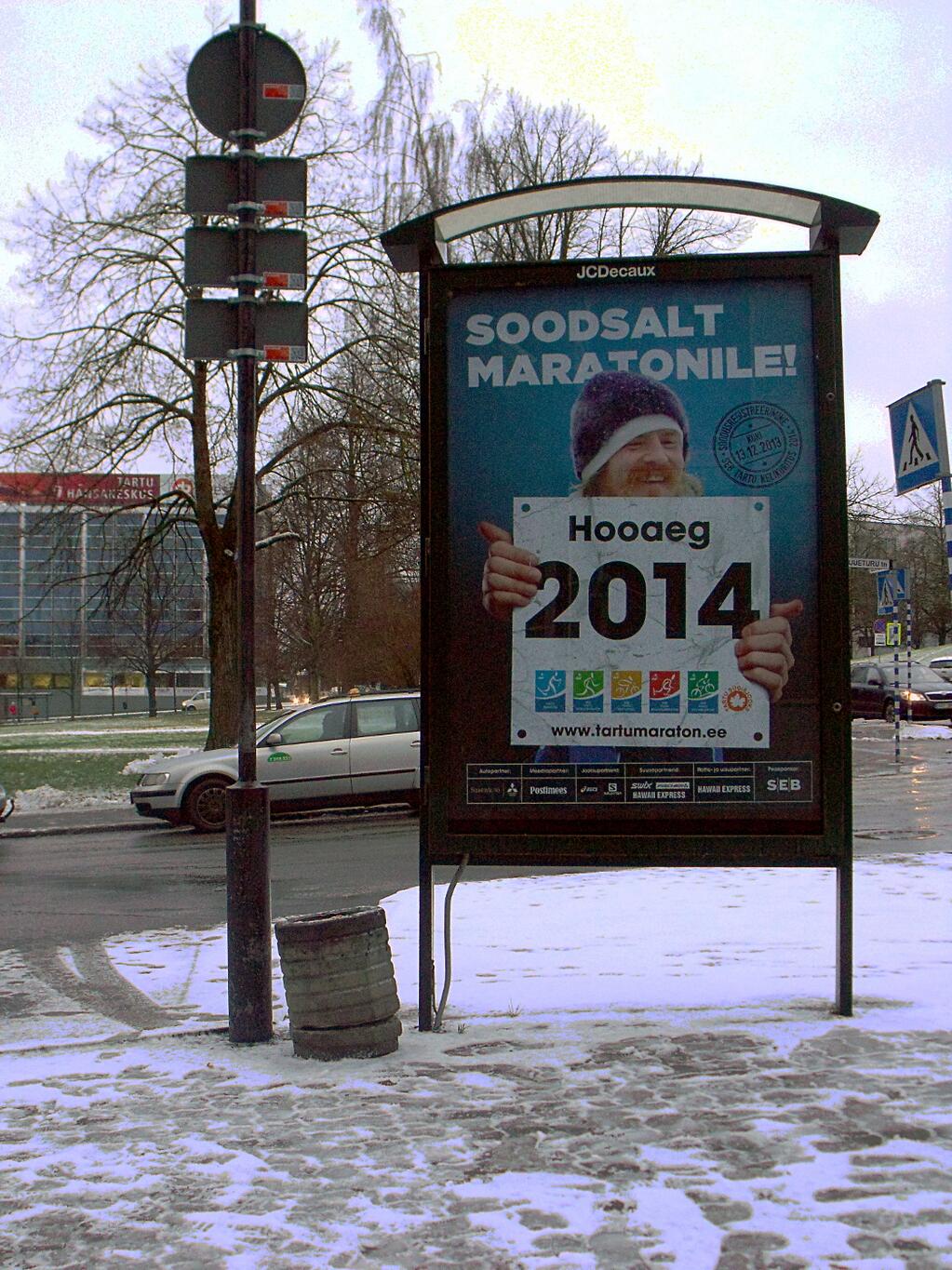 Tartu Maratoni reklaam paigaldati 05.02.2014 manuses olevates asukohtades (11 vitriini). Reklaam võetakse maha selle nädala pühapäeval 16.02.2014. Kokku kampaania 12 päeva.